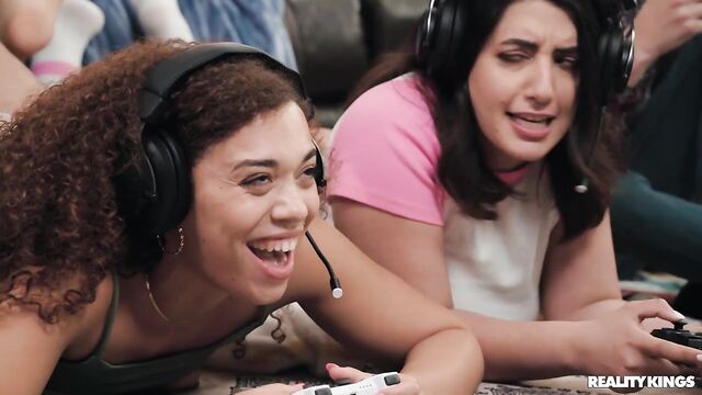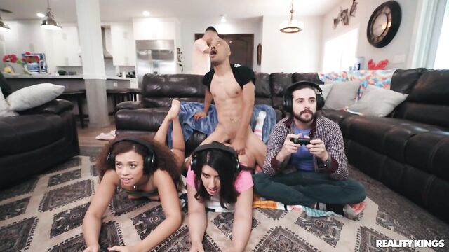 Beschreibung: Sarah Arabic's bf invited his buddies over to game, and now he's ignoring her! Sarah tries everything to get his attention, even flashing her big natural tits, and he still doesn't look up... but her friend Willow Ryder is more than interested! The girls start sucking each other's tits, and even scissoring right behind the guys. When Johnny Love notices what they're up to, they pull him onto the couch to let him motorboat them and suck out his cum. Dwayne Foxx catches sight of Sarah's big booty in her thong, so the babes take out his big cock and soon he gets to fuck them as they game.